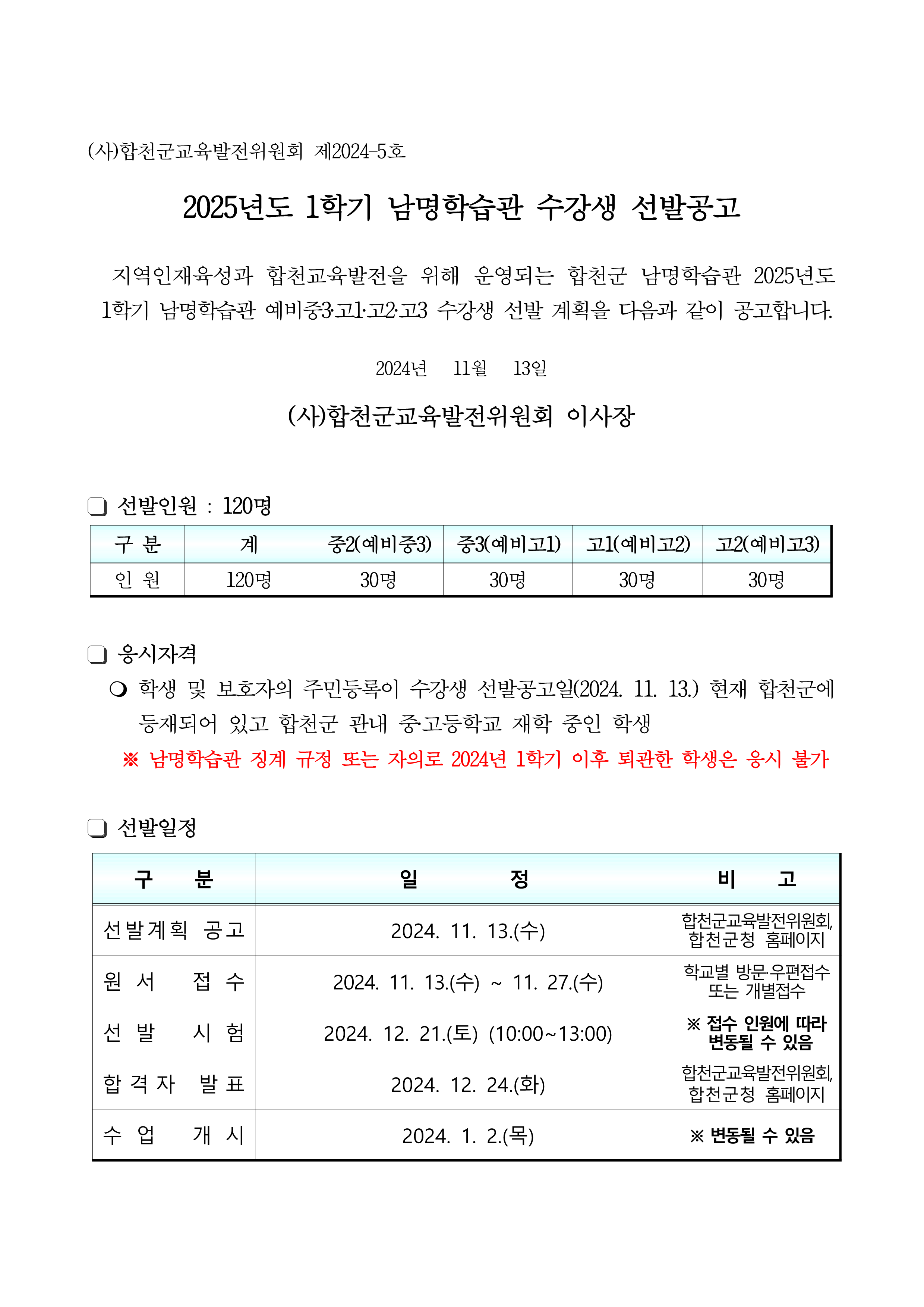 합천군 문화예술과_2025년도 1학기 남명학습관 수강생 선발공고.hwp